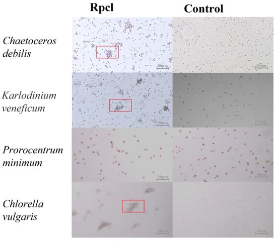 Microalgae agglutination assay of Rpcl. Rpcl: microalgae were cultured in TBS containing Rpcl and CaCl2 (10 mM). Control: microalgae were cultured in TBS containing CaCl2 (10 mM) (the red box shows the protein agglutination in the microalgae).