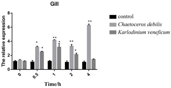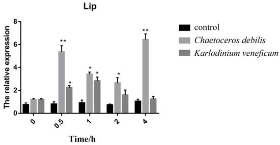 Expression levels of Rpcl in the lip of R. philippinarum after feeding with Chaetoceros debilis and Karlodinium veneficum: * p < 0.05, ** p < 0.01.