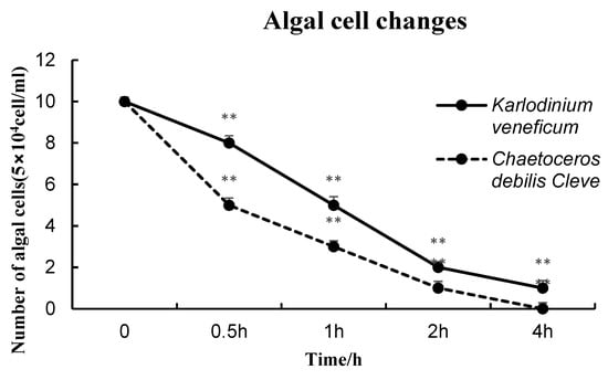 The Rpcl expression was significantly elevated at all times in the C. debilis group in contrast to the control of starving group (p < 0.05). The Rpcl expression was also significantly increased at all times in group of K. veneficum (p < 0.05, Figure 8). The gene expression in C. debilis group reached its first peak at 0.5 h, followed by a process of first decreasing and then increased back to another peak at 4 h. In K. veneficum group, the gene expression reached its peak at 1 h after feeding and declined afterward (Figure 8). In the gill tissues (Figure 9), the variation trends of the gene expressions were relatively similar as that in lips. However, compared with the two experimental groups, the expression of Rpcl in C. debilis was markedly higher compared with that in K. veneficum in most periods. In addition, it was found that the changes in the expression of the Rpcl gene in the gill and lip, the main feeding tissues, were consistent with the slope of the decrease in the number of algal cells in the water body (Figure 8, Figure 9 and Figure 10). The expression of lectins in the lip was more significant than that in the gill. Thus, it was also verified that lip lectins play a deterministic role in feeding.