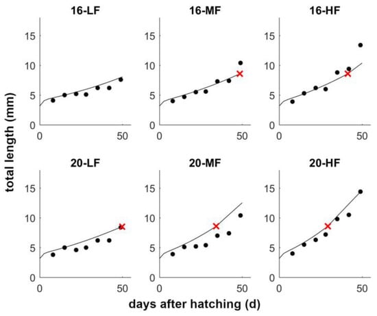 Model validation for S. solea. Larvae length (points) and DEB model larval growth predictions (lines) for S. solea larvae reared at three food availabilities (HighFood, HF; MediumFood, MF and LowFood, LF) and two constant temperatures (16 °C and 20 °C). Red X in the panels (where present) marks the end of metamorphosis as predicted by the model. Experimental conditions were modeled as follows: temperature for incubation 13 °C, hatching to birth: 16 °C, after birth: 16 °C (top row) or 20 °C (lower row). Temperature switches in the simulations are linked to life stage (maturity), not time. Size at birth will depend on the scaled food availability (f) experienced by the mother (f = 0.5), while subsequent growth will depend on experimental conditions (food and temperature) experienced by the larvae. Experimental f for larvae corresponds to feeding regimes: fLF = 0.1, fMF = 0.15, fHF = 0.18. All f values were adjusted manually. Physiological parameters were kept fixed at values listed in Table 2.