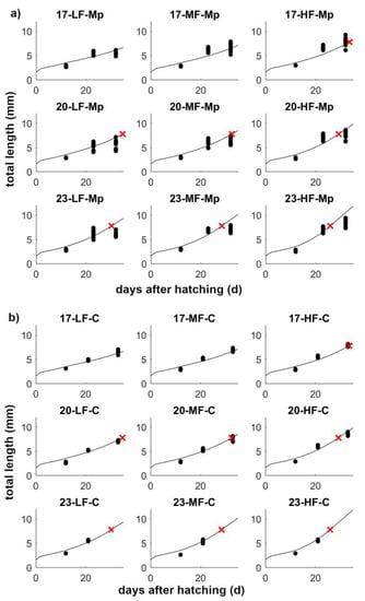 Model validation for S. senegalensis. Larvae length (points) and DEB model larval growth predictions (lines) for S. senegalensis larvae reared at three food availabilities (HighFood, HF; MediumFood, MF and LowFood, LF) and three constant temperatures (17 °C, 20 °C, and 23 °C). (a) Mp- microplates (individual fish); (b) C—containers. Red X in the panels (where present) marks the end of metamorphosis as predicted by the model. Experimental conditions were modeled as follows: temperature for incubation and first 12 days of rearing: 17 °C, afterward: 17 °C (top row), 20 °C (middle row), or 23 °C (bottom row). Temperature switches in the experimental simulations are linked to time. Size at birth will depend on the scaled food availability (f) experienced by the mother (f = 1), while subsequent growth will depend on experimental conditions (food and temperature) experienced by the larvae. Experimental f for larvae switches on day 12 from the initial fEXP = 0.6 to treatment-specific: fLF = 0.4, fMF = 0.45, fHF = 0.55. All f values were adjusted manually. Physiological parameters were kept fixed at values listed in Table 2.