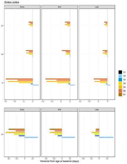 Time variance from baseline (S1, black line in figure) for age at hatching (ah), birth (ab, start of exogenous feeding), end of metamorphosis (aj), and puberty (ap) in S. solea individuals issued from early, mid and late spawning events and growing under the seven different scenarios (please see Table 1 for scenario descriptions).