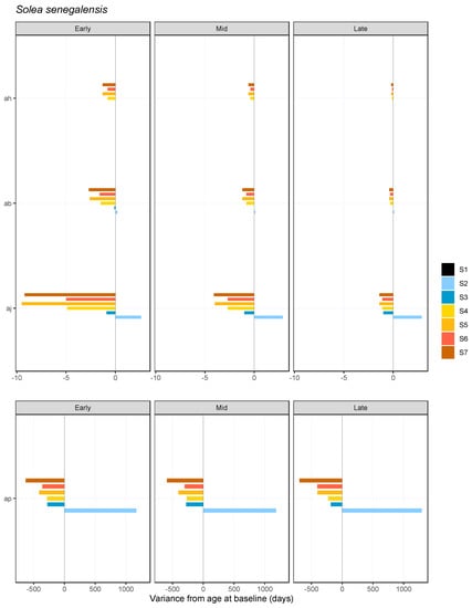The differences in the stage duration until complete metamorphosis were less marked for S. senegalensis, which showed a maximum of 9.5 days difference between baseline and the S5 (++TbX) scenario for the early-spawned individuals, while the difference was less than a day and a half in late-spawned individuals (Figure 4, top).
