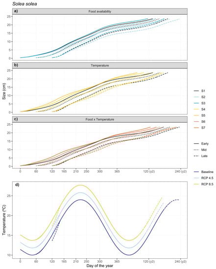 Here we simulate the effect of future CC scenarios on fishes’ early life-history traits, particularly focusing on larval growth and age at metamorphosis in two flatfish species, the common sole, Solea solea, and the Senegalese sole, S. senegalensis. Both flatfish species are aquatic resources of high commercial value, appreciated in Europe due to their flesh quality [22,23,24].
