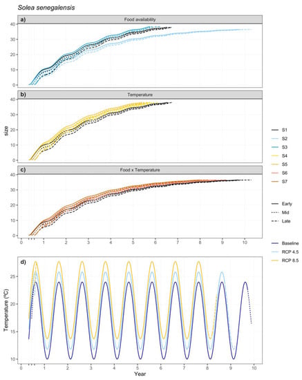 When comparing growth rates between the two species, S. senegalensis larvae showed, for all simulated scenarios, higher growth rates than S. solea larvae, which has a more homogeneous growth rate between larvae and juveniles, and as such, a less drastic difference in developmental stage growth rate than the Senegalese sole (Figure S1). Interestingly, the highest temperature increase (scenarios S5: ++T-bX and S7: ++T−X) affected, overall, the late spawners of both species more severely than earlier spawners, but in the opposite direction: while S. solea individuals grew at times slower than their temp-baseline counterparts, S. senegalensis individuals grew faster (Figure 5b,c and Figure 6b,c).