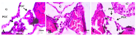 Histological observations of the 15 dph diploid loaches showed that PGCs in the peritoneal epithelium below the renal ducts on both sides and the genital ridge surrounding the protrusion folds in the body cavity, could they observe the primordial gonads formed by these (Figure 3A). At 15 dph, the hybrid triploid loaches had body lengths between 9.5 and 12.2 mm. Histological observations of the 15 dph hybrid triploid loaches showed that PGCs were not observed in two thirds (20/30) of hybrid triploid loaches (Figure 3B). PGCs were only observed in a third (10/30) of the 15 dph hybrid triploid loaches (Figure 3C). This was not significantly different from the diploid loaches shown.