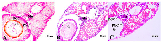 Histological images of the gonads of loaches at 15 dph. (A) diploid loach; (B) hybrid triploid loach without gonads; (C) hybrid triploid loach; G: digestive tract; Mn: middle kidney; PGC: primordial germ cell.