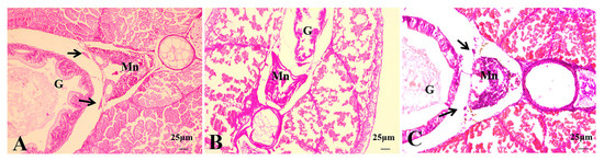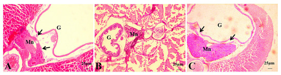 Histological observations were conducted as previously described by Ma (2014) and He et al. (2020) [19,20]. The fixed samples were dehydrated with ethanol, embedded in paraffin, and serially sectioned—only using entire fish samples—at a slice thickness of 5–7 μm. Slices were stained with hematoxylin–eosin and sealed with a neutral gum before observation under a Leica DM 2000 (Leica, Nussloch, Germany) microscope. The images were captured by a Leica DF 450 CCCD unit and processed with Leica and Adobe Photoshop software version 23.4.2 (PS., San Jose, USA).