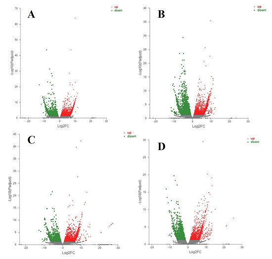Volcano map of differentially expressed genes (DEGs) of hybrid triploid loaches at (A) 4 dph, (B) 15 dph, (C) 22 dph, and (D) 50 dph.