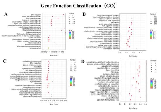 Bubble diagram of predicted functions encoded of hybrid triploid loaches by DEGs at (A) 4 dph, (B) 15 dph, (C) 22 dph, and (D) 50 dph.