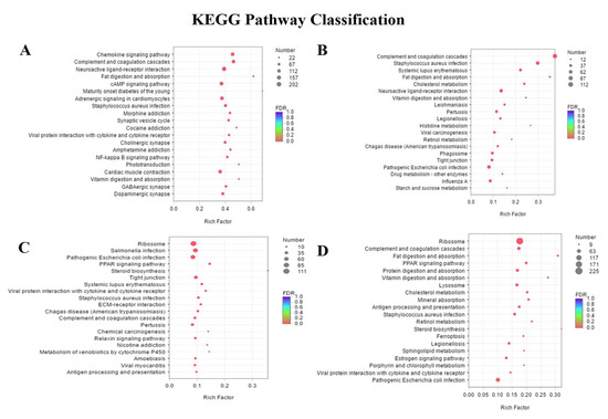 Bubble diagram of pathways in which DEGs are predicted to participate in hybrid triploid loaches at (A) 4 dph, (B) 15 dph, (C) 22 dph, and (D) 50 dph.