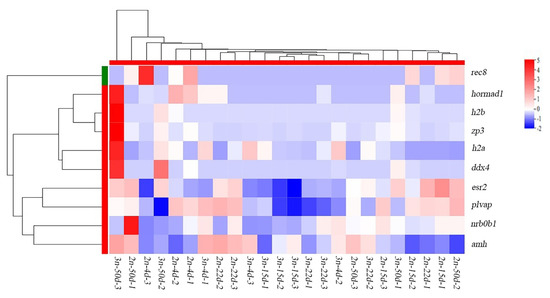 To explore the differences in gonadal development between diploid and hybrid triploid loaches, the DEGs associated with gonad development in hybrid triploid loaches were identified through a combination of sequence similarity searches in databases such as the NCBI Genbank, as well as analyses of the GO and KEGG signaling pathways. By querying six databases, amh, hormad1, rec8, plvap, h2a, and nrb0b1 were identified. Moreover, through the KEGG signaling pathway analysis, zp3 and h2b were identified which are part of the estrogen signaling pathway, whereas ddx4 and esr2 are part of the steroid biosynthesis pathway. They are possibly related to mature and primitive cells in the eggs of hybrid triploid loaches. Thus, the relationships between germ cell survival and DEGs were investigated through DEG clustering analysis by determining the clustering pattern of DEG expression levels at different periods. The specific expression levels for each DEG at each period are shown in a cluster analysis heat map (Figure 9).