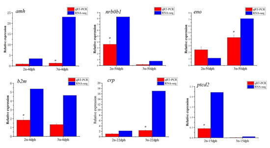 Six DEGs (ptcd2, b2m, crp, nrb0b1, eno, and amh) were selected for quantitative PCR detection in the gonads of loaches at 4 dph, 15 dph, 22 dph, and 50 dph. The relative expression levels of amh, b2m, and eno in the hybrid triploid loaches were significantly higher than in the diploid loaches (p < 0.05). The relative expression levels of ptcd2, crp, and nrb0b1 in the diploid loaches were significantly higher than in the hybrid triploid loaches (p < 0.05). These results were consistent with the results of transcriptome analyses, corroborating their reliability (Figure 10).