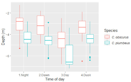 C. plumbeus were deeper than C. obscurus at all times of the day, with a mean difference of 1.5 m during the day and at night (Figure 2). In crepuscular times, this number changes towards a higher number (1.8 m) at dawn and a lower number (1.26 m) at dusk, suggesting C. plumbeus might start the movement earlier than C. obscurus, thus creating a bigger gap in the morning and a smaller one going back up at night.