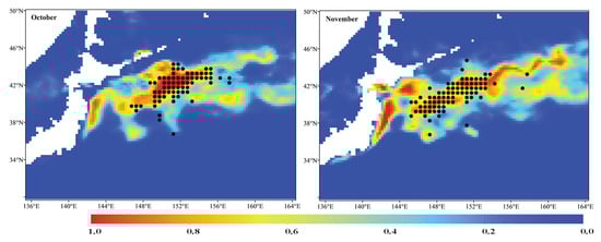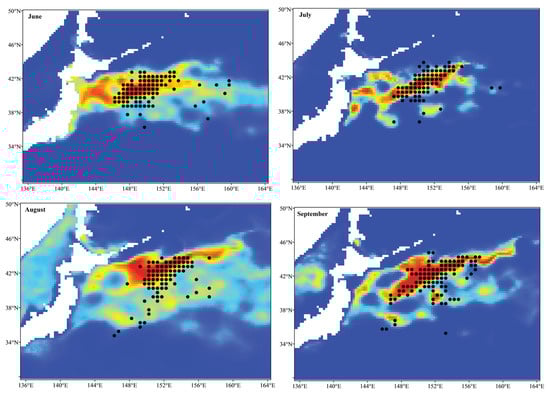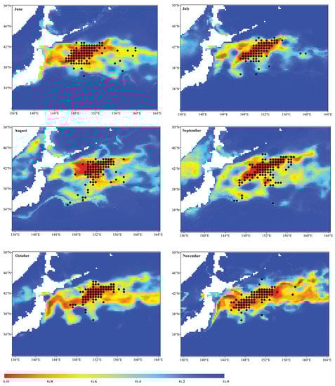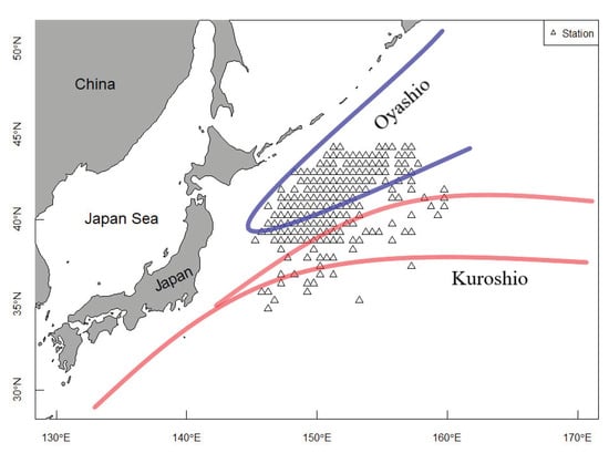 - Takasuka, A.; Kuroda, H.; Okunishi, T.; Shimizu, Y.; Hirota, Y.; Kubota, H.; Sakajl, H.; Kimura, R.; Ito, S.I.; Oozeki, Y. Occurrence and density of Pacific saury Cololabis saira larvae and juveniles in relation to environmental factors during the winter spawning season in the Kuroshio Current system. Fish. Oceanogr. 2014, 23, 304–321. [Google Scholar] [CrossRef]
