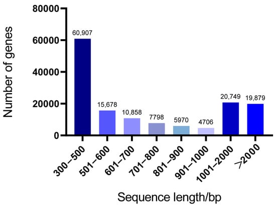 Transcriptome sequencing was performed on 15 ovarian samples from five different developmental stages of females, and a total of 352,975,807 raw reads were obtained, with an average of 23,531,720 raw reads per sample. A total of nine testicular samples from three different developmental stages of males were sequenced, and 210,202,884 raw reads were obtained, with an average of 23,355,876 raw reads per sample. After filtering, a total of 328,723,887 and 201,496,918 clean reads were obtained for the ovaries and testes, respectively, with a corresponding average of 21,914,926 and 22,388,546 per sample. Together, the clean data of each sample were more than 5.90 Gb, and all values of the Q20 and Q30 percentages were higher than 98% and 94%, respectively. The proportion of clean reads accounted for more than 94% of the raw data, and the N50 was 2008 bp (Table 2). The filtered data were assembled with Trinity software, and a total of 146,537 unigenes were obtained after hierarchical clustering with Corset, with a sequence length ranging from 301 bp to 28,406 bp and an average length of 1144 bp. A total of 60,907 unigenes had a length of 300–500 bp, accounting for 41.56% of the total number of unigenes. The second largest number of unigenes was 1001–2000 bp in length, numbering 20,749 and accounting for 14.16% of the total number of unigenes; 19,879 unigenes had a length of more than 2000 bp, accounting for 13.57% of the total number of unigenes (Figure 1). The BUSCO evaluation showed that the transcript completeness was 91%, indicating that the quality of data assembly was good.