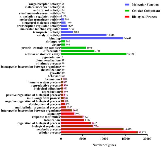 Based on the annotated results from the GO database, 30,520 unigenes were classified into 42 subcategories of three GO categories including “Biological processes”, “Cellular components”, and “Molecular functions”. “Biological process” was the largest category, in which two subcategories, “Cellular processes” and “Metabolic process”, contained the largest number of unigenes at 17,872 and 14,495, respectively. Out of the “Cellular component” category, the subcategory “Cellular anatomical entity” consisted of the largest number of unigenes (15,176). In the “Molecular function” category, 14,449 unigenes were in the “Binding” subcategory, and 10,548 unigenes were related to “Catalytic activity” subcategory (Figure 2).