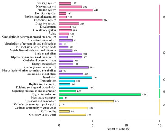 The KEGG database annotation results showed that a total of 8901 unigenes were classified into 35 different secondary pathways of 5 branches (branch A to E), among which the top three secondary pathways were “Signal transduction”, “Transportation and catabolism” and “Endocrine system”, where the number of unigenes included were 1084, 724, and 574, respectively (Figure 3).