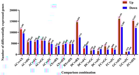 Statistics of differentially expressed genes in different stages of gonadal development of Macrobrachium rosenbergii. AC—Stage I ovary; DC— Stage III ovary; FC—Stage VI ovary; GC—Stage VIII ovary; ZC—Stage VIII ovary; AX—Stage I testis; BX—Stage II testis; DX—Stage III testis.