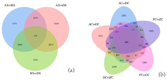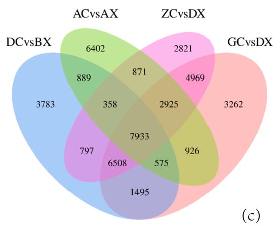Venn diagram of differentially expressed genes in different gonadal development stages of Macrobrachium rosenbergii. (a): three pairwise comparisons of the testes; (b): the top 5 DEG pairwise comparisons of ovaries; (c) the top 4 DEG pairwise comparisons between testes and ovaries. AC—Stage Ⅰ ovary; DC—Stage III ovary; FC—Stage VI ovary; GC—Stage VII ovary; ZC—Stage VIII ovary; AX—Stage Ⅰ testis; BX—Stage II testis; DX—Stage III testis.
