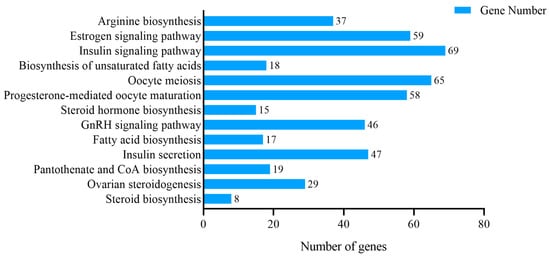 Based on the KEGG enrichment analysis of the DEGs shared by testes or ovaries at different development stages, we found 13 KEGG signaling pathways that might be related to testis or ovary development; the pathways consisted of steroid biosynthesis, ovarian steroidogenesis, pantothenic acid and CoA biosynthesis, insulin secretion, fatty acid biosynthesis, the GnRH signaling pathway, steroid hormone biosynthesis, progesterone-mediated oocyte maturation, oocyte meiosis, unsaturated fatty acid biosynthesis, the insulin signaling pathway, the estrogen signaling pathway, arginine biosynthesis, and other signaling pathways. Among them, the insulin signaling pathway (involving 69 overlaping DEGs), oocyte meiosis (including 65 overlaping DEGs), the estrogen signaling pathway (59 common DEGs), and progesterone-mediated oocyte maturation (58 overlapping DEGs) were the top four pathways with the highest number of shared DEGs (Figure 6).