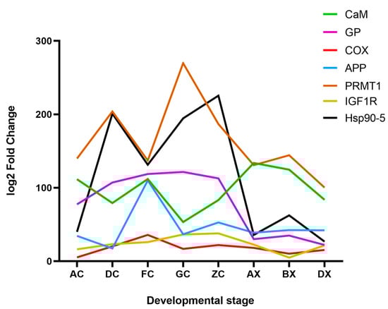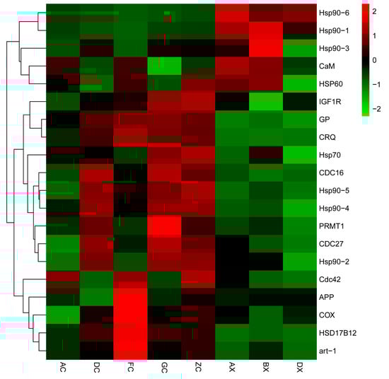 To investigate the relationship between different development stages and DEGs, 20 DEGs related to gonadal development were selected for DEG clustering analysis to show the expression pattern of DEGs. Heat maps of DEGs demonstrated that most genes were differentially expressed between testes and ovaries, and especially between ovaries in Stages III (DC), VI (FC), VII (GC), and VIII (ZC) and testes in each developmental period (AX, BX, and DX) (Figure 7). For example, the calmodulin gene (CaM) was consistently highly expressed in the developing testes of male, but was much less expressed in the developing ovaries. The croquet protein (CRQ), glycogen phosphorylase (GP), and insulin-like growth factor I receptor gene (IGF1R) were consistently highly expressed in the ovaries from the endogenous yolk synthesis stage (DC) to the maturation (ZC) of the ovaries, but was lowly expressed in the testes. The cell division regulatory protein 42 gene (Cdc 42) was highly expressed at the beginning of ovary development in female M. rosenbergii, whereas it was lowly expressed at the beginning of testis development. In addition, some genes were differentially expressed at different stages of testis or ovary development. For example, the cyclooxygenase gene (COX) and amyloid-beta-like protein (APP) were highly expressed when the female ovary enters the rapid developmental stage (FC), and the protein arginine methylesterase gene (PRMT1) was highly expressed when the ovary matured (GC), but they were lowly expressed during other periods of ovary development. For heat shock protein 90 (Hsp 90) gene members, Hsp 90-2, Hsp 90-4, and Hsp 90-5 were consistantly highly expressed after the initiation of yolk protein synthesis (DC) in the ovaries of M. rosenbergii, but was lowly expressed in the testes. Figure 8 shows the detailed expression level of several common EDGs in the KEGG signaling pathway related to gonadal development.