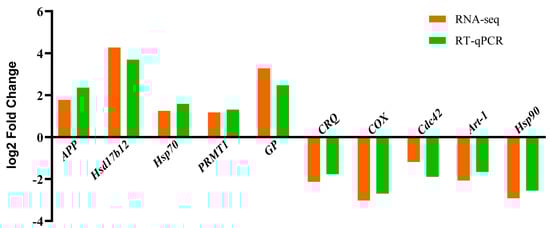 Ten DEGs in the KEGG signaling pathway associated with gonadal development were selected for RT-qPCR validation. The selected genes included croquet protein (CRQ), cyclooxygenase (COX), amyloid-beta-like protein (APP), cell division control protein 42 (Cdc 42), hydroxysteroid (17-beta) dehydrogenase 12a (Hsd17b12), enoyl-CoA reductase-1 (Art-1), heat shock protein 70 (Hsp 70), heat shock protein 90 (Hsp 90), protein arginine methyltransferases 1 (PRMT 1), and glycogen phosphorylase (GP). RT-qPCR data are shown in Figure 9. The five down-regulated genes in the RNA-seq, CRQ, COX, Cdc 42, Art-1 and Hsp 90, were down-regulated in RT-qPCR as well, and the five up-regulated genes in the RNA-seq, APP, Hsd17b12, Hsp 70, PRMT 1, and GP, were up-regulated in the RT-qPCR validation. The validation results were basically consistent with the expression levels of the corresponding genes in the transcriptome, indicating that the transcriptomic data were reliable.