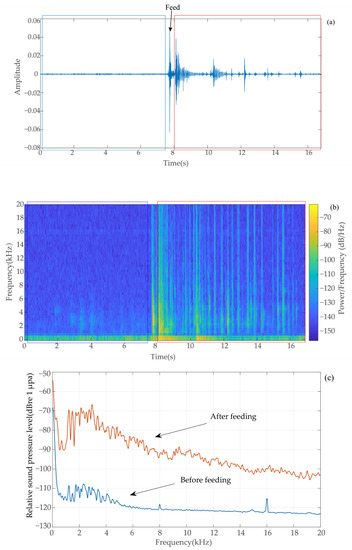 Fish behavior can visually reflect the state of feeding, reproduction, stress, and other activities in aquaculture [1,2], and an in-depth study of fish behavior can provide important information and guidance for aquaculture. Vocalization is an important fish behavior, and acoustic signals accompany different activities such as reproduction, territorial behavior, foraging, and swimming [3,4]. Fish have a variety of different vocal mechanisms that can be broadly divided into active and passive vocalizations; for example, fish in the process of breathing exhibit these vocalizations due to the rhythmic movement of the gill covers and breathing sounds [5]; Moreover, some male fish living on the bottom with their bodies or fins touching or hitting the ground create sounds to court female fish [6]. The signal intensity and frequency generated by different fish behaviors are different; hence, analyzing and quantifying the feeding sound signals of fish and determining the feeding sound characteristics of fish can provide theoretical guidance for the intelligent feeding of aquatic fish [7,8,9].
