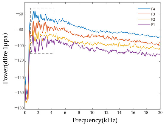 The power spectrum represents the variation of the acoustic as a function of frequencies, and we applied the Welch power spectrum estimation method to conduct the feature analysis. Welch’s method [20] is more traditional than the direct power spectrum methods and computationally less expensive and robust [21]. The latter are used with too large or small information data without spectral line fluctuations and poor resolution conditions.