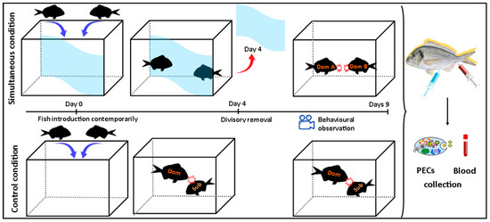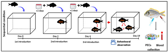 In the “sequential model” experimental set up, three specimens were sequentially placed in the aquarium (200 L), with an interval period of two days. Briefly, as shown in Figure 1, the first fish was introduced into the experimental tank, after two days a second fish was added, and after two more days a third fish was introduced. Each group was observed for a period of 15 days after the final introduction, to assess the social rank among the specimens, and at the 15th day, blood was sampled, and PECs collected for further biochemical and phagocytosis analysis (see specific sections for procedural details). Experiments using the sequential model were repeated 9 times, resulting in the monitoring of N = 27 specimens, 3 specimens for each replicate.