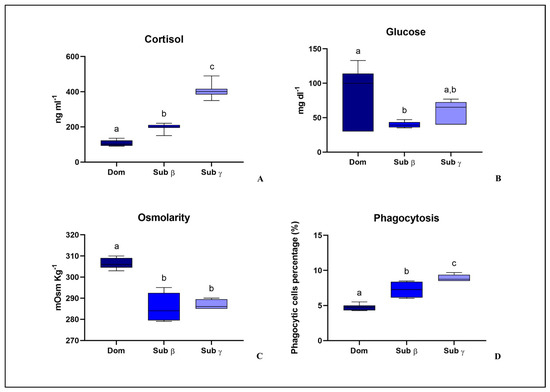 Mean (±SD) of plasmatic parameters of dominant (dark blue histogram), subordinate (β) (light blue histogram), and subordinate (γ) (violet histogram) seabream (Sparus aurata) involved in the sequential model (n. 3 fish per tank, replicated 9 times). The panels present (A) cortisol concentration (ng mL−1), (B) glucose concentration (mg dL−1), (C) osmolarity level (mOsm kg−1) and (D) phagocytosis (%). Different letters (a, b and c) over the bars indicate significant statistical differences between groups (ANOVA test, followed by a Tukey’s HSD post-hoc test).