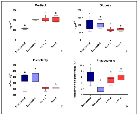 Mean (±SD) of plasmatic parameters of control fish, dominant (dark blue histogram), subordinate (violet histogram), and codominant (Dom A and Dom B) (red histogram) seabream (Sparus aurata) involved in the simultaneous model (n. 2 fish for tank, replicated 9 times). The panels present (A) cortisol concentration (ng mL−1), (B) glucose concentration (mg dL−1), (C) osmolarity level (mOsm kg−1) and (D) phagocytosis (%). Different letters over the bars indicate significant statistical difference between groups (ANOVA test, followed by a Tukey’s HSD post-hoc test).