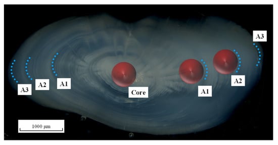 Sagittal otolith section of a three-year-old Larimichthys polyactis under transmitted light showing the analysed regions for stable isotope δ13C and δ18O. The analysed regions include the core, A1, and A2 zones (red-filled spheres, diameter 500 μm). The blue dotted curves represent annual rings.