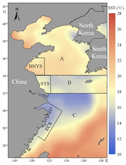 The Yellow and East China Seas cover all habitats across the complete life history of L. polyactis, including spawning, foraging, and overwintering periods [,]. Following traditional population division of L. polyactis, these study areas were divided into three regions (A, B, and C) (Figure 1). Regions A, B, and C represent the BNYS, SYS, and ECS populations, respectively []. Regions A/B and region B/C were separated by 34° N and 32° N lines, respectively [].