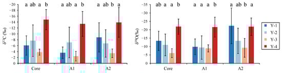 Otolith δ13C and δ18O variation in different drilling zones for Larimichthys polyactis from Y-1, Y-2, Y-3, and Y-4 groups. Different letters indicate significant differences between growth zones (p < 0.05).