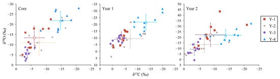 At the otolith core zone of L. polyactis, the mean (±SD) values of δ13C and δ18O for Y-1 to Y-4 groups were −6.06 ± 3.28 and −13.38 ± 5.74; −7.69 ± 5.36 and −10.98 ± 6.47; −3.80 ± 1.03 and −6.07 ± 2.65; and −14.83 ± 3.42 and –21.83 ± 4.55, respectively. The differences in otolith δ13C and δ18O between the Y-3 and Y-4 groups were statistically significant (p < 0.01; Figure 4). The biplots of otolith δ13C and δ18O showed clear separation (Figure 5). Moreover, the value of otolith δ13C for the Y-4 group was significantly higher than that of Y-1, and the value of otolith δ18O for the Y-4 group was significantly higher than that for Y-2 (p < 0.01; Figure 4). There were no significant differences in otolith δ13C and δ18O among the Y-1, Y-2, and Y-3 groups (p > 0.01; Figure 4).