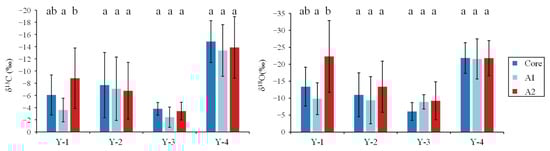 At the otolith A2 zone of L. polyactis, the mean (±SD) values of δ13C and δ18O for Y-1 to Y-4 groups were −8.81 ± 4.97 and −22.29 ± 10.59; −6.74 ± 4.66 and −8.90 ± 2.12; −3.42 ± 1.45 and −9.23 ± 5.59; and −13.87 ± 5.05 and −21.80 ± 5.19, respectively. The values of otolith δ13C and δ13O for the Y-1 and Y-4 groups were significantly higher than those for Y-3 (p < 0.01; Figure 4). The biplots of otolith δ13C and δ18O for the Y-3 group showed an obvious separation between Y-1 and Y-4 (Figure 3). In contrast to the otolith core and A2 zones, there were no significant differences in otolith δ13C and δ18O among Y-1, Y-2, and Y-4 groups (p > 0.01; Figure 4).