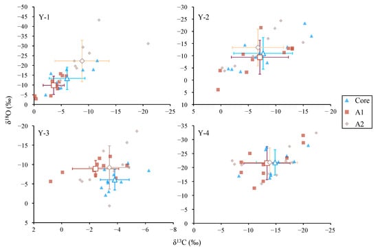 Biplots of otolith δ13C and δ18O values in different drilling zones for Larimichthys polyactis from Y-1, Y-2, Y-3, and Y-4 groups. The hollow square, rhombus, and triangle represent the mean value of corresponding groups, and the cross represents the plus or minus error bars.
