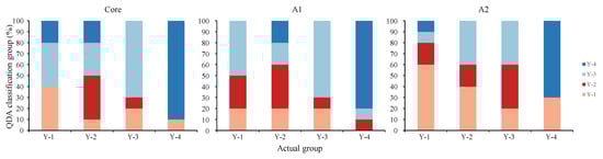 Similar to the core zone, based on QDA, Y-3 and Y-4 groups showed good assignment in the A1 zone with 70% and 80% accuracy, respectively (Figure 8). In contrast, 80% of the Y-1 group was misclassified as Y-2 or Y-3, showing an extremely low accuracy rate (Figure 8).