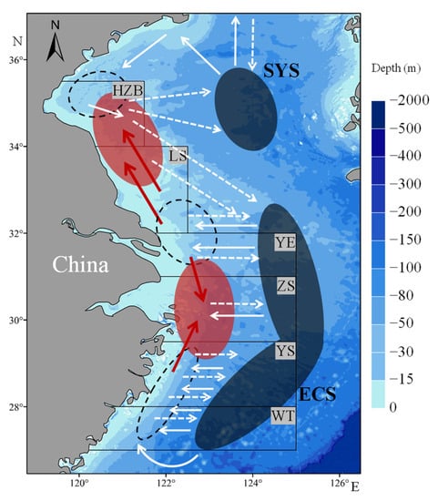 Schematic map showing migratory routes of L. polyactis between spawning, nursery, and overwintering grounds. The black dashed ellipses represent the main spawning grounds in the southern Yellow and East China Seas []. The red and black solid ellipses represent the larvae and overwintering aggregations, respectively. The white concrete and dashed arrows represent the spawning and overwintering migratory routes, respectively. The solid red arrows represent the passive dispersal direction of L. polyactis eggs or larvae.