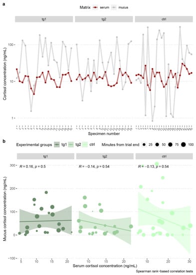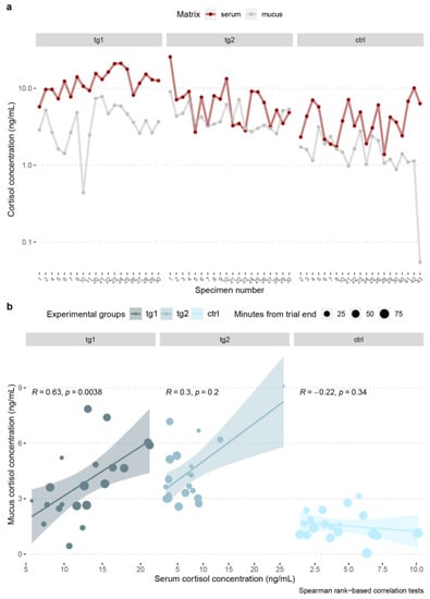 3.6. Blood Serum–Skin Mucus Cortisol Correlation