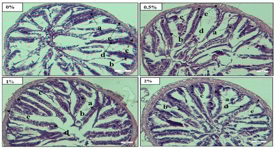 According to the distal intestine histomorphological observation, the mid gut of fish fed 0, 0.5, 1, and 2% FPH diets displayed alterations of the lamina propria, lamina epithelial mucosae, tunica muscularis, stratum compactum, villus structure as well as goblet cell arrangements (Figure 1). The 2%-FPH diet-fed fish were found to have a well-anchored epithelial wall with well-arranged goblet cells, long villus structures, stratum compactum, and tunica muscularis when compared with those fed with other treatment diets. Moreover, 0.5%- and 1%-FPH-treated fish guts showed some histological development compared to those fed the control diet, although lamina epithelial mucosa, tunica muscularis, and numerous goblet cells were often distributed among all the fish groups.