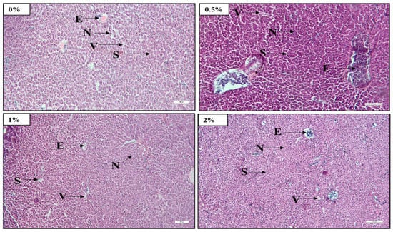 The liver is an excellent indicator of a fish’s nutritional status []. The light microscopic observation of histological slides showed that raising the FPH levels in test diets resulted in a notable increase in nuclei and erythrocyte numbers and decreased vacuolar cytoplasm in the liver. This result specified that 2%-FPH-fed fish groups had improved liver health compared to other treatment fish. When FM was substituted with fermented soy pulp at levels of 50% in the diet of African catfish, a similar observation was recorded by Abdul Kari et al. []. Pham et al. [] similarly observed a commensurate reduction in the vacuole numbers when using tuna hydrolysate at 60 g/kg in a poultry by-product meal diet. However, another finding has shown that a very high amount of FPH increased liver tissue necrosis, fat deposition, and vacuolar cytoplasm [].