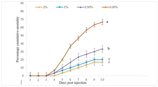 At the end of the feeding trial, 30 fish from each treatment group, including the positive control, were injected with 0.1 mL of A. hydrophila (LD50–2.3 × 107 CFU/mL) and fed with a basal diet. Fishes injected with 0.1 mL of phosphate-buffered saline (PBS) served as a negative control. The survival rate was recorded daily for ten days. Fresh blood from moribund fish was collected, and streaking was carried out from kidneys on RS (Rimlar Shots) media (Specific for A. hydrophila isolation) for the confirmation of fish death. The cumulative percent mortality of fish was calculated according to Rathore et al. [].
