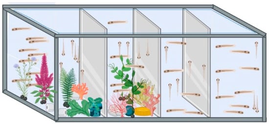 - Wafer, L.N.; Jensen, V.B.; Whitney, J.C.; Gomez, T.H.; Flores, R.; Goodwin, B.S. Effects of Environmental Enrichment on the Fertility and Fecundity of Zebrafish (Danio rerio). J. Am. Assoc. Lab. Anim. Sci. 2016, 55, 291–294. [Google Scholar]
