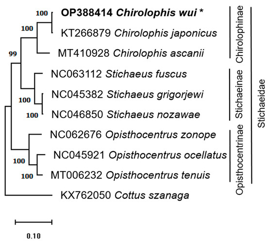 The phylogenetic tree was obtained using the complete mitochondrial genome sequences from ten species (nine from the Stichaeidae family and Cottus szanaga from the Cottidae family as an outgroup) and 1000 bootstrap repetitions using the maximum-likelihood approach. The numbers on the branches represent the bootstrap values, and the star next to Chirolophis wui denotes the species used in this research.