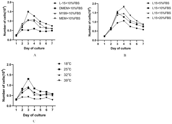 Figure 2. Growth kinetics of TAH-11cell line at Passage 50: (A) effects on cell growth of different medium at 25 °C; (B) effects of different concentrations of FBS in L-15 medium on cell growth at 25 °C; (C) effects of different culture temperatures on cell growth in L-15 medium containing 10% FBS.