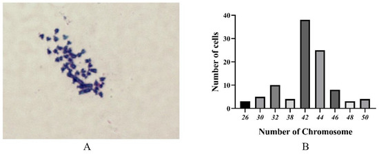 Figure 3. Chromosome morphological features and frequency distribution of TAH-11-11 cells: (A) chromosome morphology of TAH-11 cells at Passage 50; (B) chromosome numbers were counted in colchicine-treated TAH-11 cells at Passage 50.