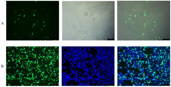 The transfection efficiency of TAH-11 was investigated at Passage 70 in this study. The green fluorescent protein (GFP) expression vector pGFP-N1 (Beyotime, Shanghai, China) was transfected into TAH-11 cells and 293T cells after the cells were inoculated in 12-well plates (Corning, New York, NY, USA) at 25 °C for 24 h. The monolayer cell was washed with L-15, 1 μg of plasmid was added per well according to the manufacturer’s instructions for the transfection reagent Lipofectamine 3000 (Invitrogen, Waltham, MA, USA), and the results of the transfection and negative controls were observed after 48 h under a fluorescence microscope (Zeiss, Jena, Germany).