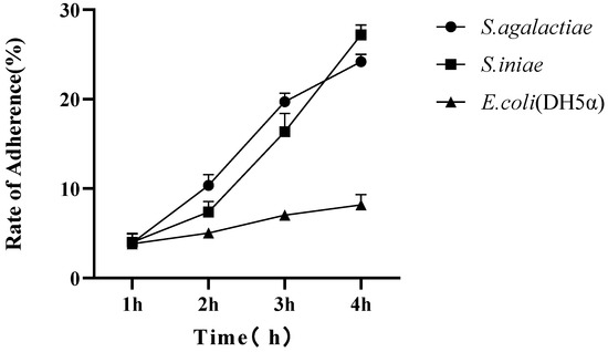 In order to evaluate the adhesion of S. agalactiae and S. iniae to TAH-11 cells, E. coli (DH5α) was considered to be a nonpathogenic bacterium and served as a control [29]. As shown in Figure 8, analyzing the adherence rates of three strains, we observed that the adhesion of S. agalactiae and S. iniae to TAH-11 cells increased with time, but the adhesion of E. coli (DH5α) increased to a smaller extent. These results indicated that Streptococcus spp. can adhere to TAH-11 cells, which provided a basis for S. agalactiae and S. iniae to infect TAH-11 cells.